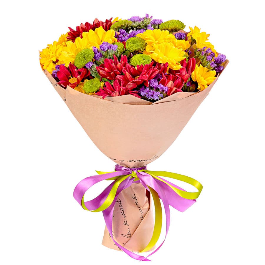 Хризантема кустовая микс (желтая, красная, зеленая), статица. Упаковка (лента, пленка, крафт, сетка, пленка матовая)