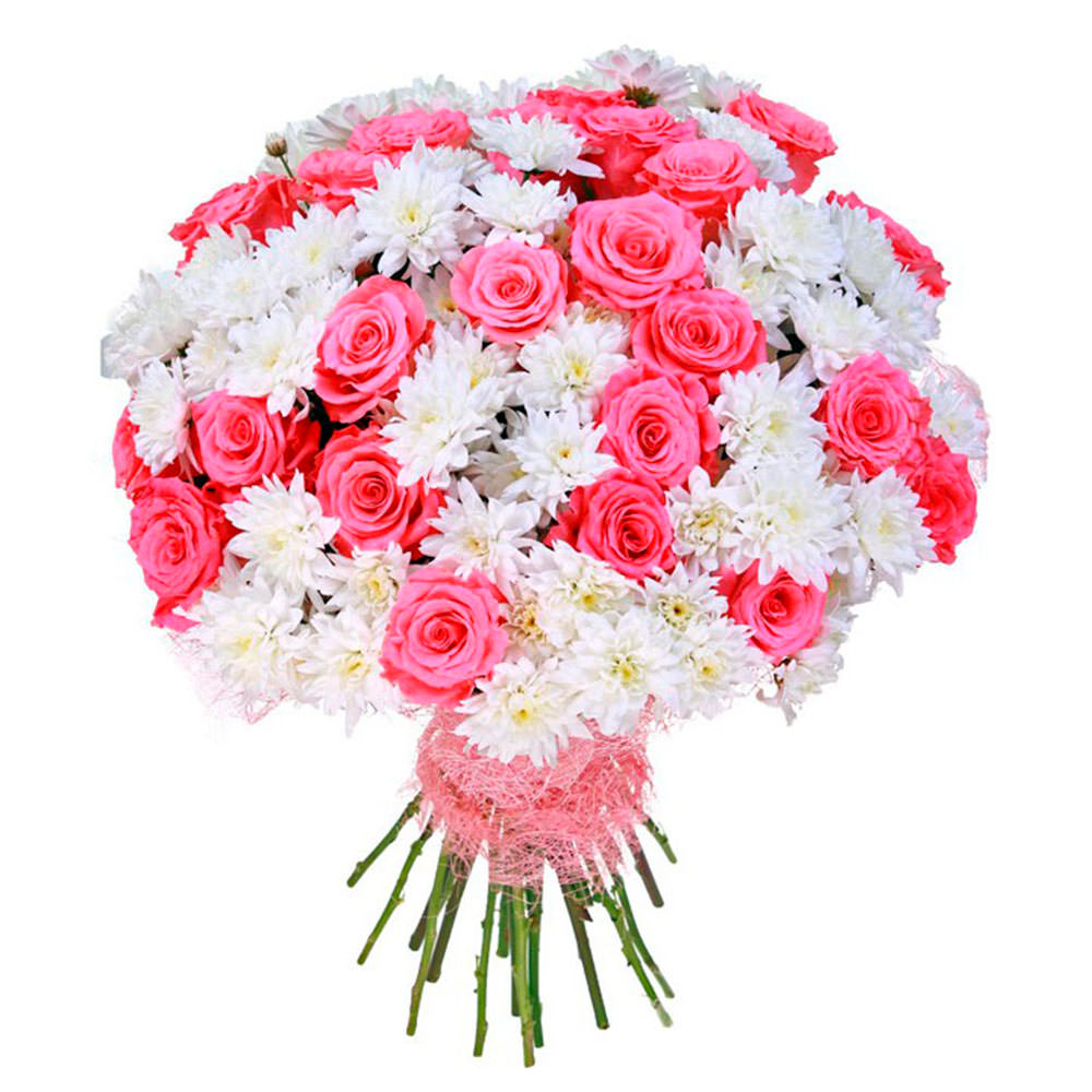 Роза одноголовая розовая, хризантема кустовая белая. Упаковка (лента, пленка, крафт, сетка, пленка матовая)