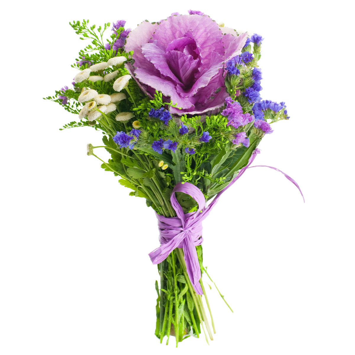 Брассика, маргаритки мини белые, статица синяя и фиолетовая, зелень. Упаковка (лента, пленка, крафт, сетка, пленка матовая)