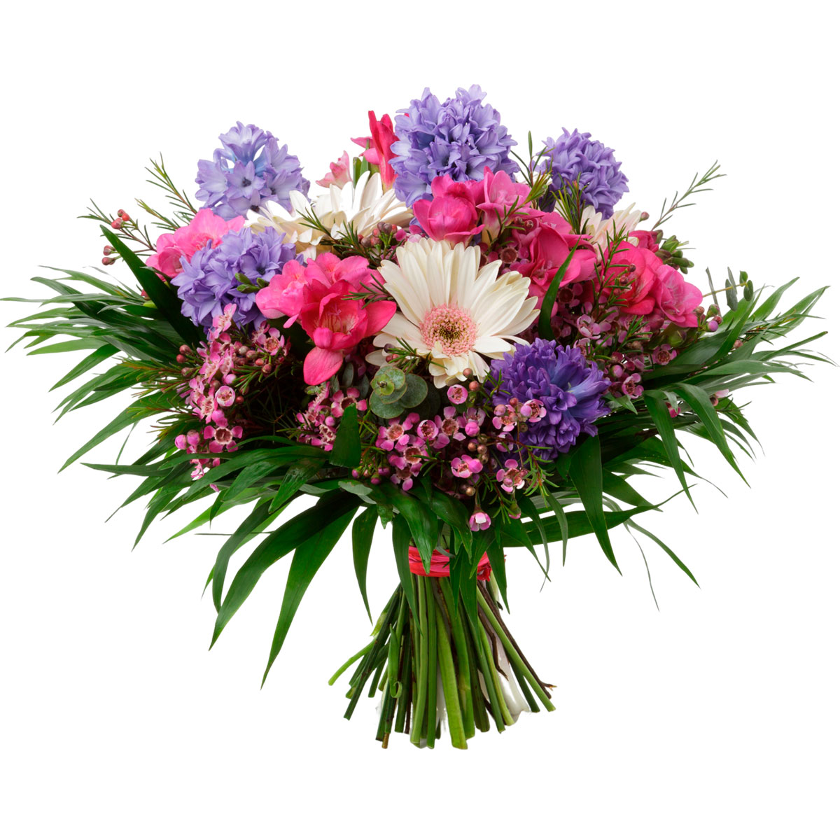 Гербера белая, фрезия розовая, гиацинт фиолетовый, ваксфлауэр, зелень. Упаковка (лента, пленка, крафт, сетка, пленка матовая)