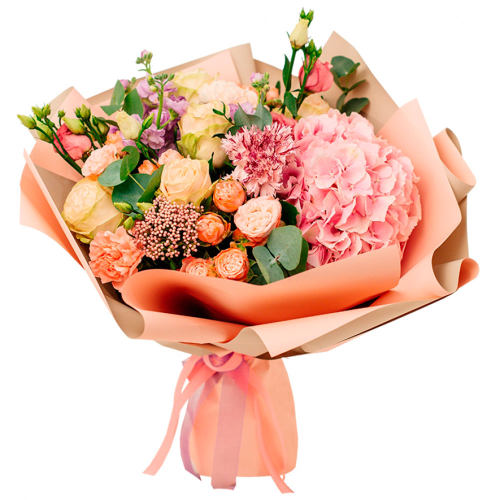 Гортензия розовая, роза кустовая розовая, эустома кремовая, роза одноголовая кремовая, маттиола сиреневая, эвкалипт. Упаковка (лента, пленка, крафт, сетка, пленка матовая)