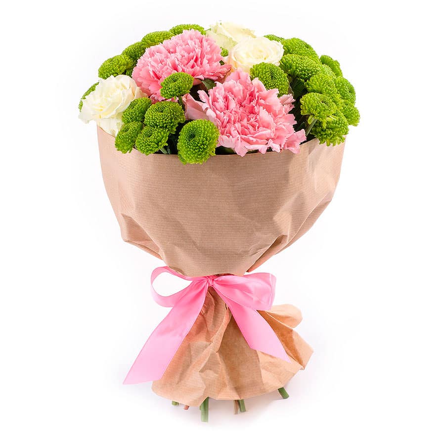 Хризантема кустовая зеленая, роза одноголовая белая, гвоздика розовая. Упаковка (лента, пленка, крафт, сетка, пленка матовая)