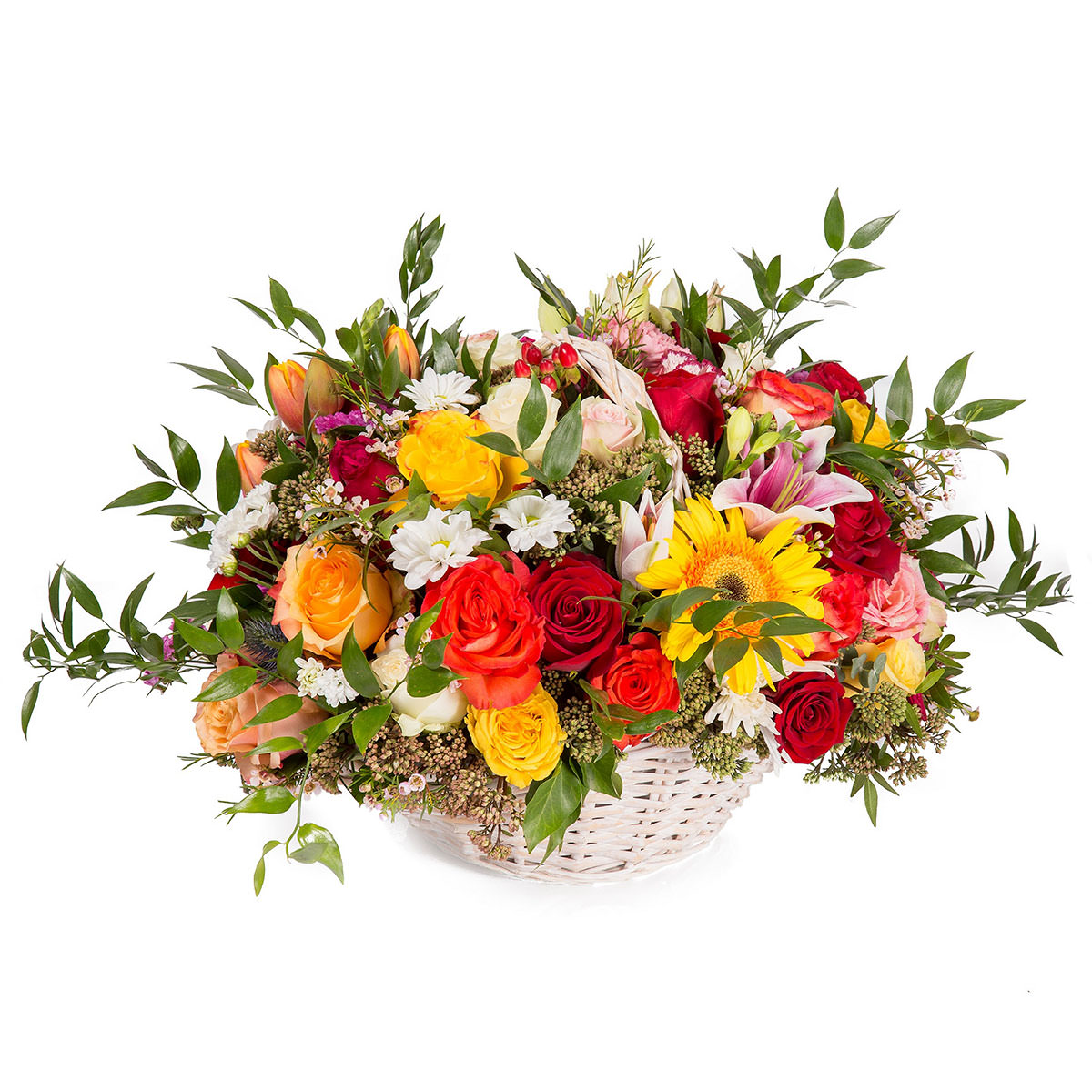 Гербера желтая, роза одноголовая разных цветов, тюльпан персиковый, хризантема кустовая белая, лилия розовая, ваксфлауэр, эрингиум, зелень. Упаковка (Корзина, оазис, ящик).