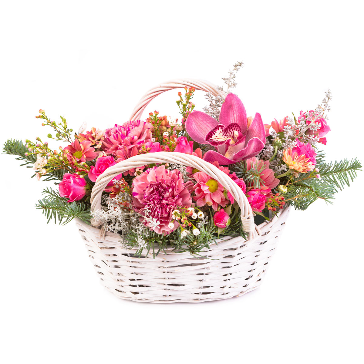 Орхидея розовая, гвоздика розовая, роза кустовая розовая, хризантема кустовая розовая, ваксфлауэр, пихта. Упаковка (Корзина, оазис, ящик).