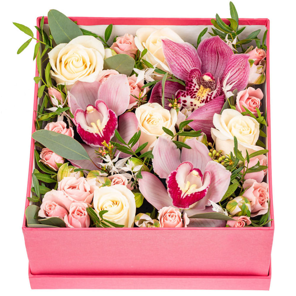 Орхидея розовая, роза кустовая кремовая, роза одноголовая кремовая, фисташка. Упаковка (шляпная коробка, квадратный бокс, коробка сердце, оазис)