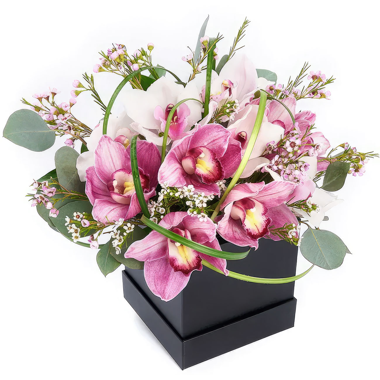 Орхидея микс (розовая, белая), эвкалипт, оазис. Упаковка (шляпная коробка, квадратный бокс, коробка сердце, оазис)
