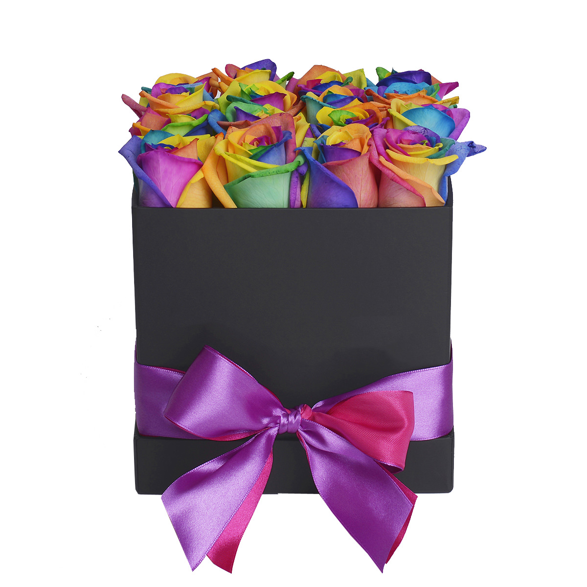 Роза одноголовая радужная. Упаковка (шляпная коробка, квадратный бокс, коробка сердце, оазис)