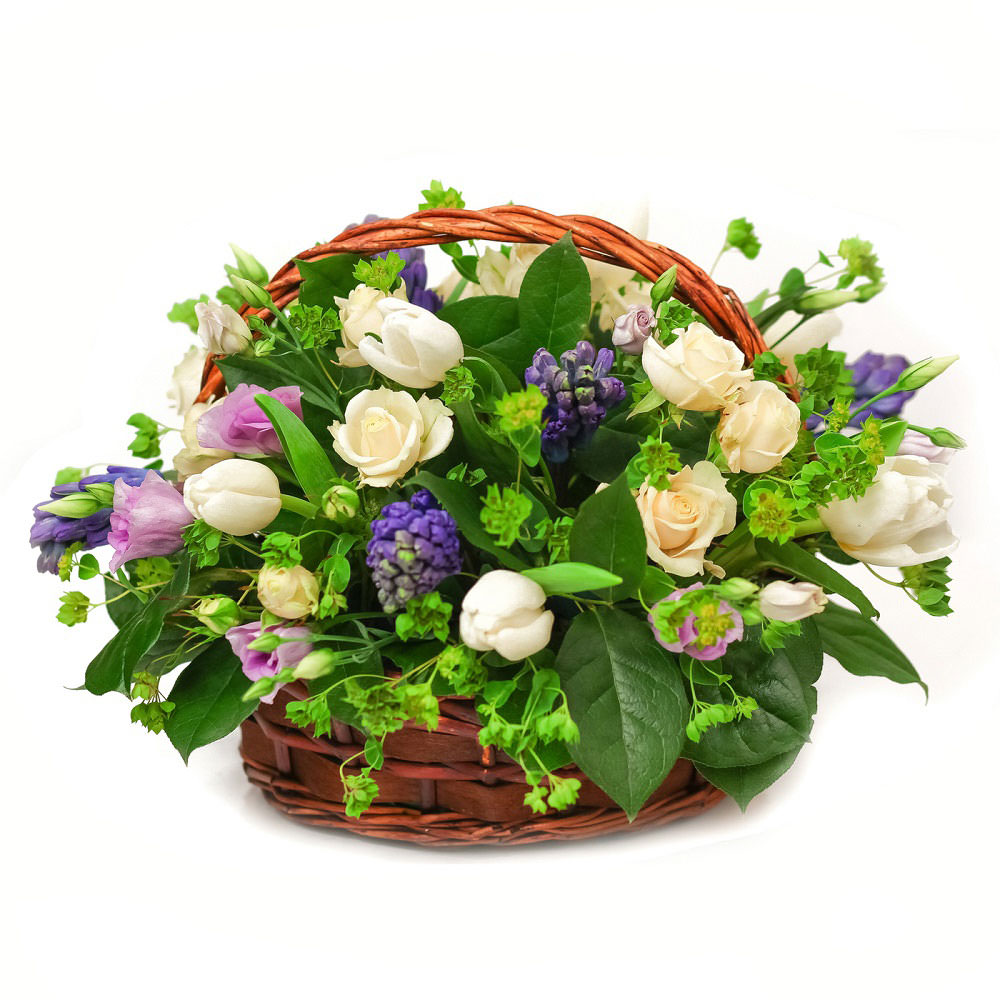 Роза кустовая кремовая, тюльпан белый, гиацинт, буплерум, эустома сиреневая, салал. Упаковка (Корзина, оазис).