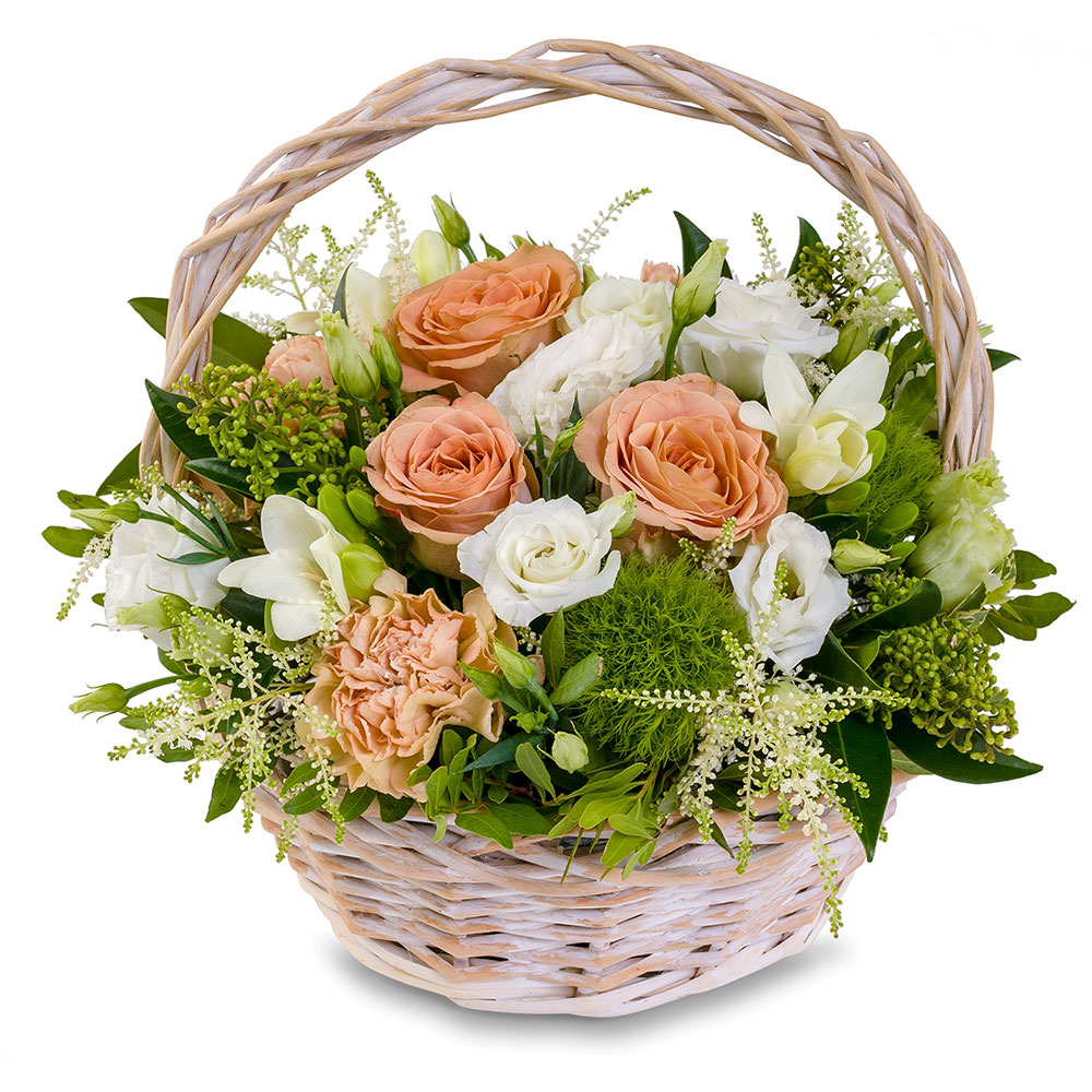 Скимия, гвоздика пудровая, роза одноголовая пудровая, фисташка, эустома белая, фрезия белая, астильба. Упаковка (Корзина, оазис).