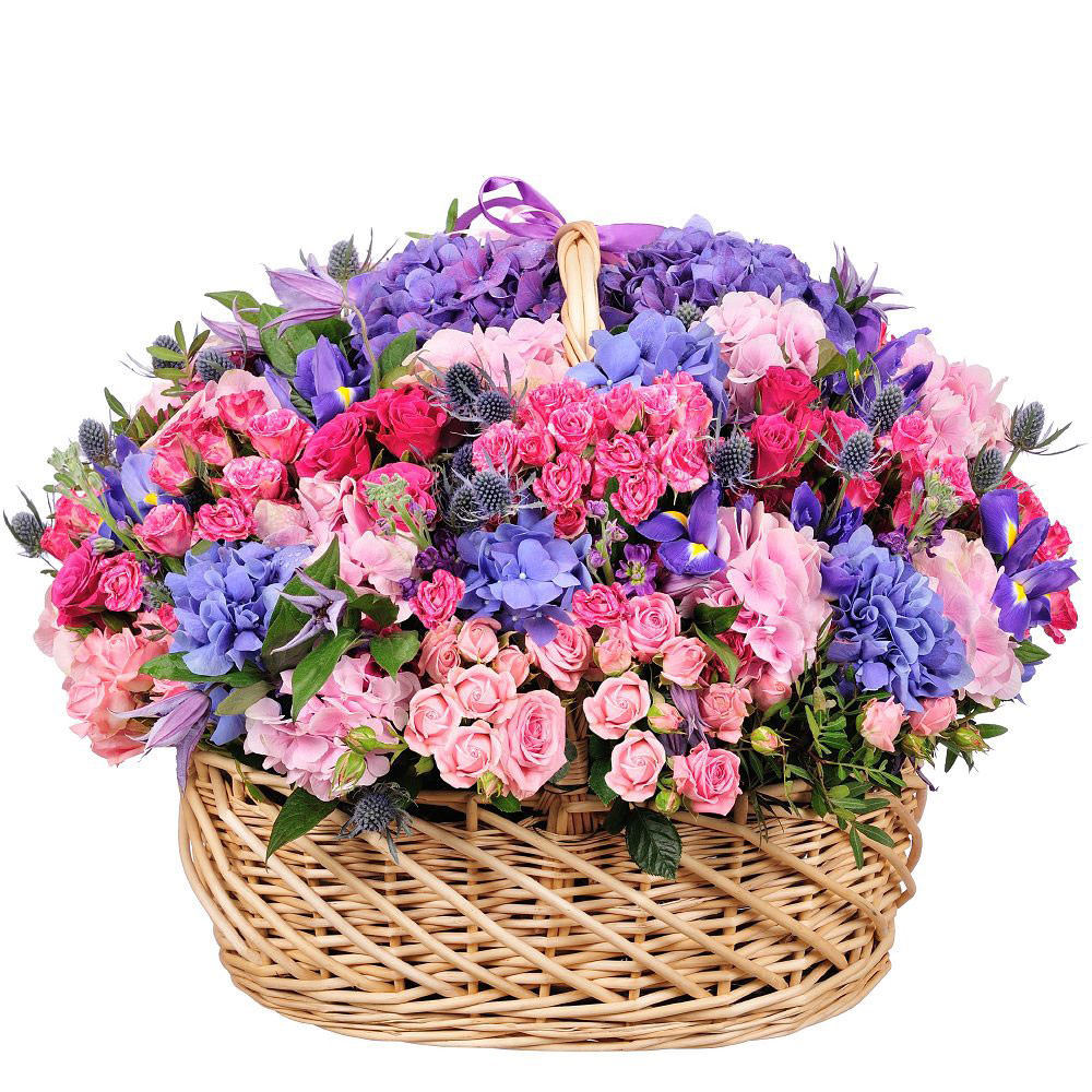Роза кустовая микс (несколько оттенков розового), гортензия микс, эрингиум, зелень. Упаковка (Корзина, оазис).